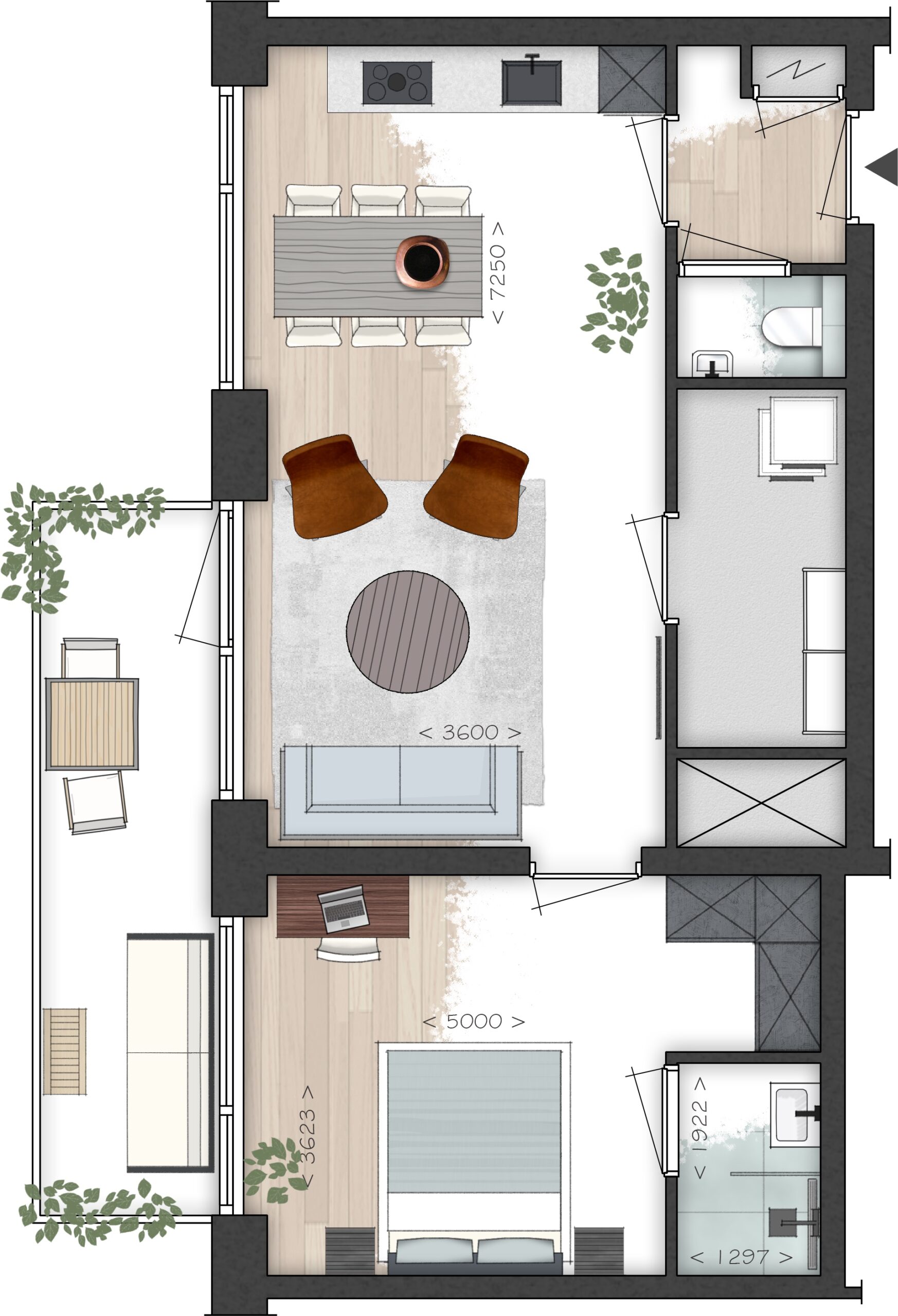 Wonen in The Hill kan ook heel comfortabel met twee kamers. Deze tweekamer appartementen vind je op de 5e tot en met de 12e verdieping en hebben een woonoppervlakte van circa 55 m². Door de open indeling en de verdiepingshoge ramen voelt het appartement ruim en licht aan.